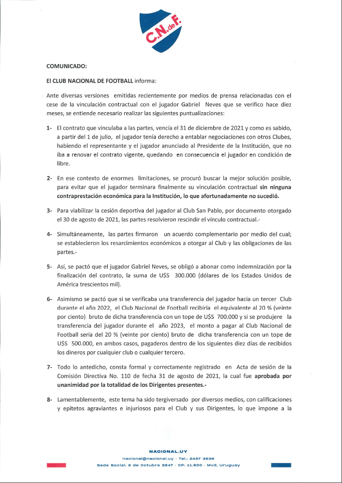 Ante diversas versiones emitidas recientemente por medios de prensa relacionadas con el cese de la vinculación contractual con el jugador Gabriel Neves que se verificó hace diez meses, se entiende necesario realizar las siguientes puntualizaciones: