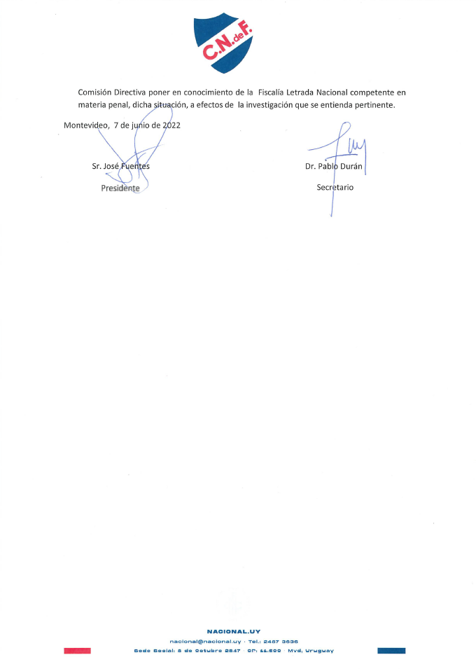 - Lamentablemente, este tema ha sido tergiversado por diversos medios, con calificaciones y epítetos agraviantes e injuriosos para el Club y sus Dirigentes, lo que impone a la Comisión Directiva poner en conocimiento de la Fiscalía Letrada Nacional competente en materia penal, dicha situación, a efectos de la investigación que se entienda pertinente.