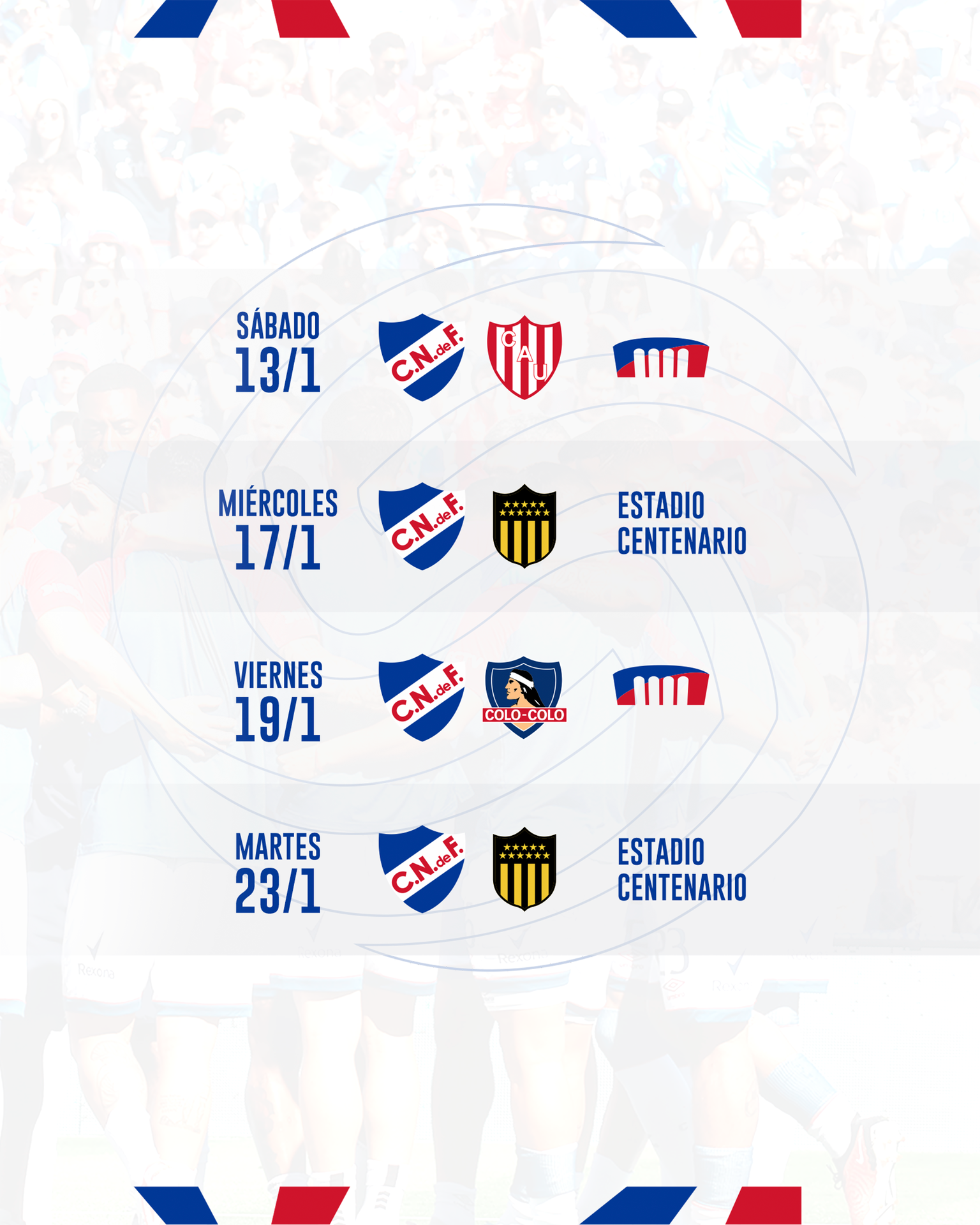 El segundo partido será el primero de los dos clásicos a disputarse ante Peñarol el miércoles 17 de enero en el Estadio Centenario.