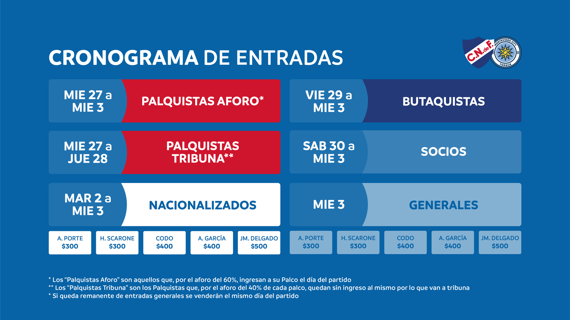 Nacionalizados: podrán comprar sus entradas desde el 2/11 al 3/11. Los precios serán para la Abdón Porte $300, para la José María Delgado $500 y para la Atiliio Garcia $400.