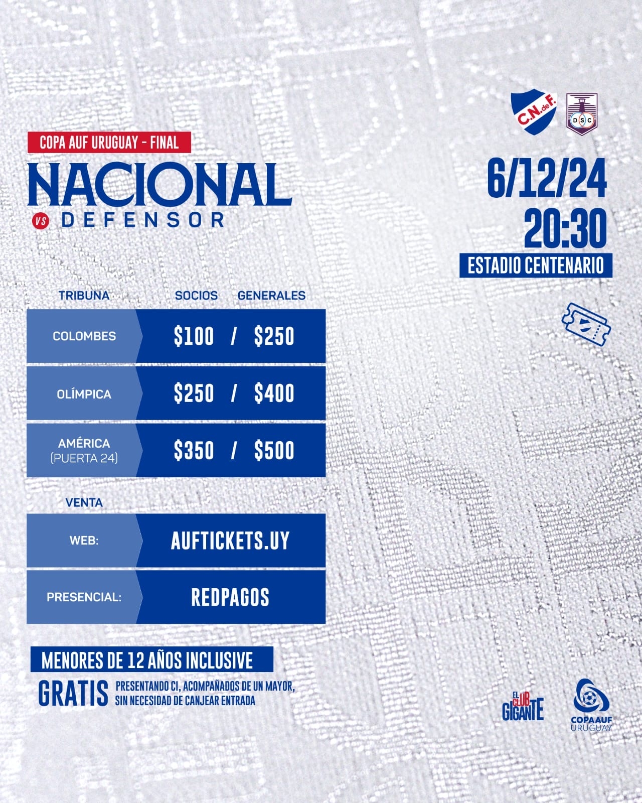 Las entradas se puden adquirir vía web a través de auftickets.uy, así como también de forma presencial en cualquiera de los locales de RedPagos.