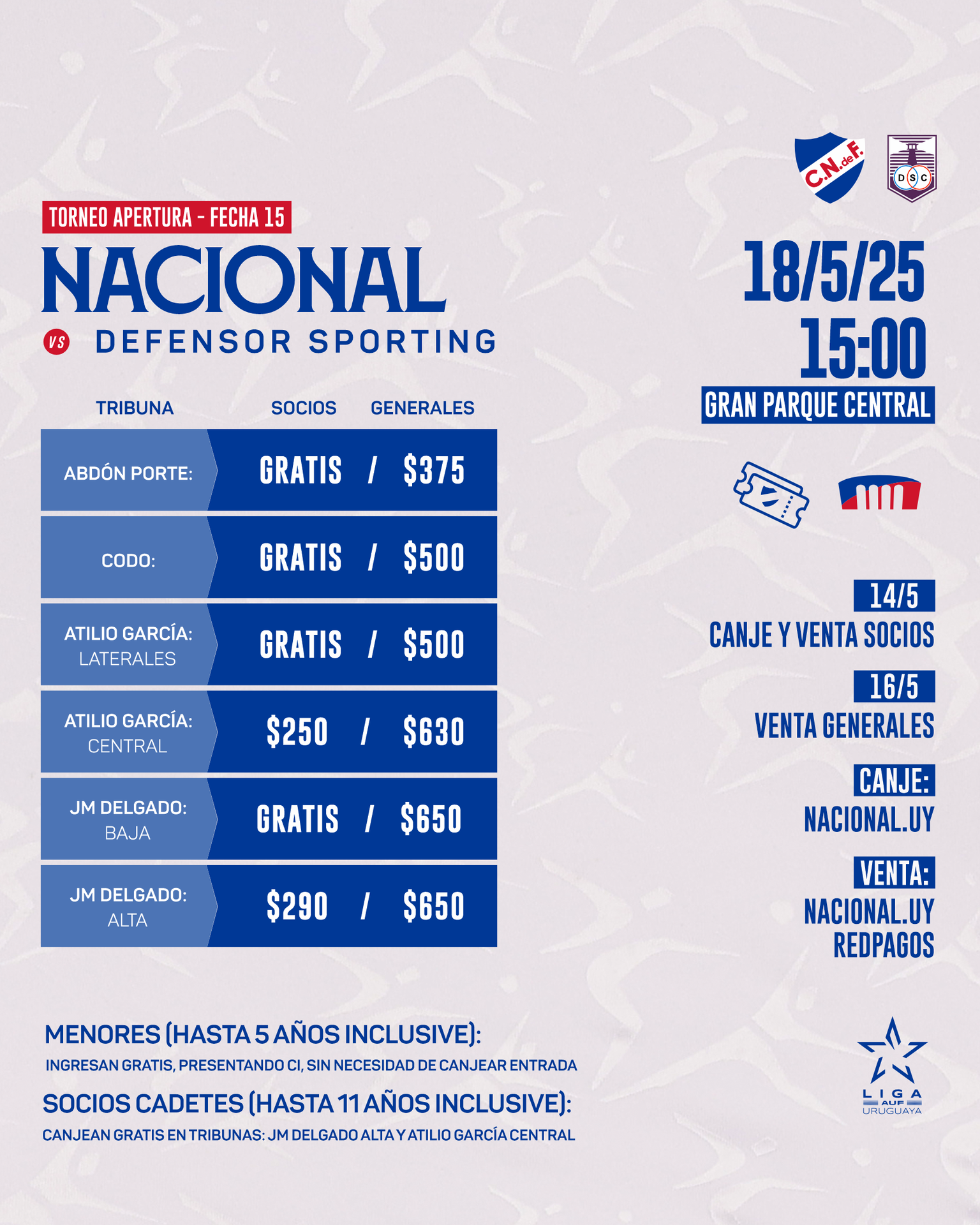 Los menores de hasta 5 años inclusive (acompañados por un mayor y presentando cédula de identidad) ingresarán gratis en todas las tribunas sin necesidad de comprar entrada, sin derecho a ocupar butaca. Los socios cadetes menores de 11 años podrán canjear entrada únicamente en los sectores altos (1 al 7) de la tribuna José María Delgado y Atilio central (4-10-11-12).