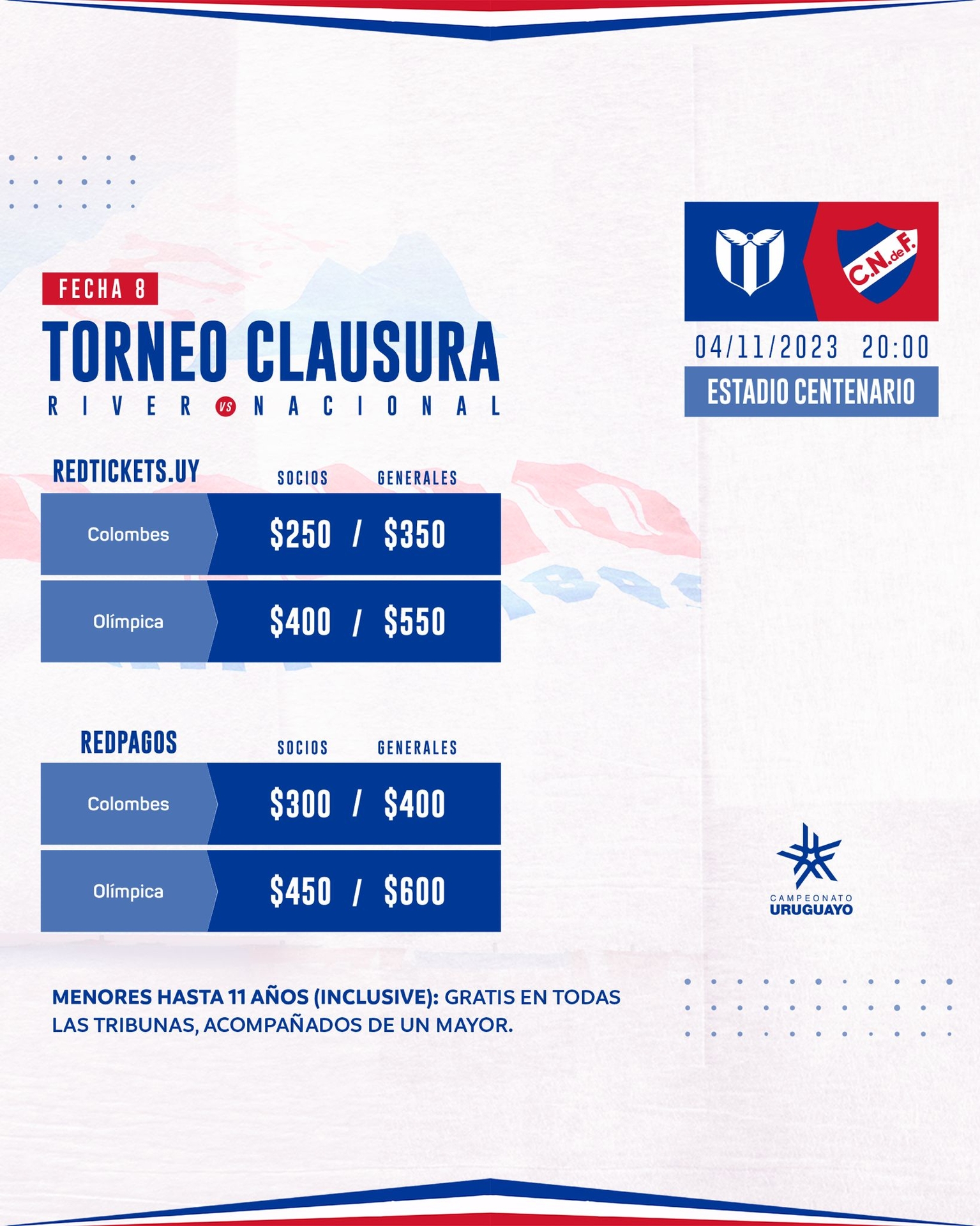 Los menores de hasta 11 años inclusive ingresan gratis en todas las Tribunas acompañados de un mayor, sin necesidad de canjear entrada.