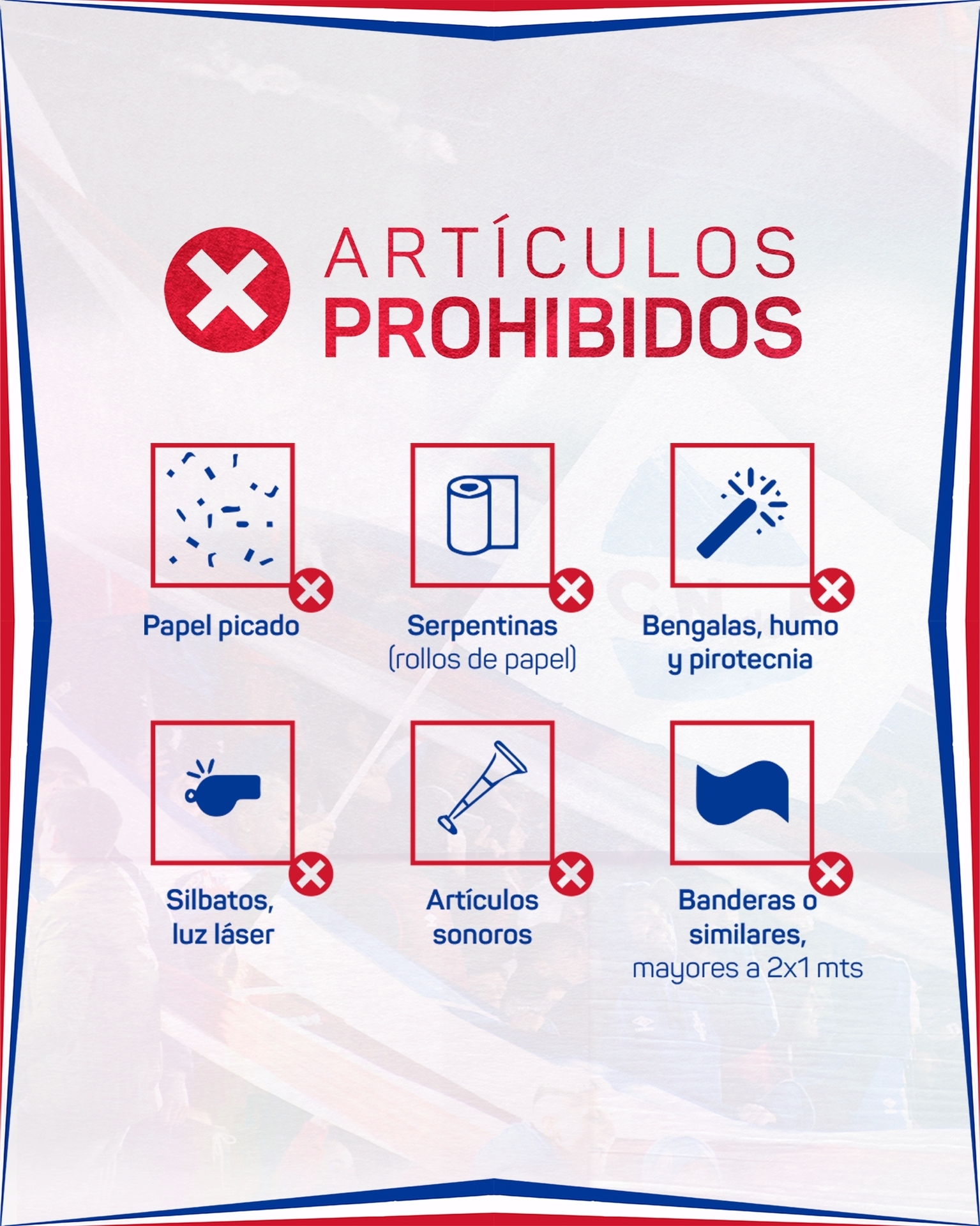 ¿Qué NO está permitido llevar? Papel picado, serpentinas, bengalas, humos y banderas de mayor medida a la autorizada (2x1).