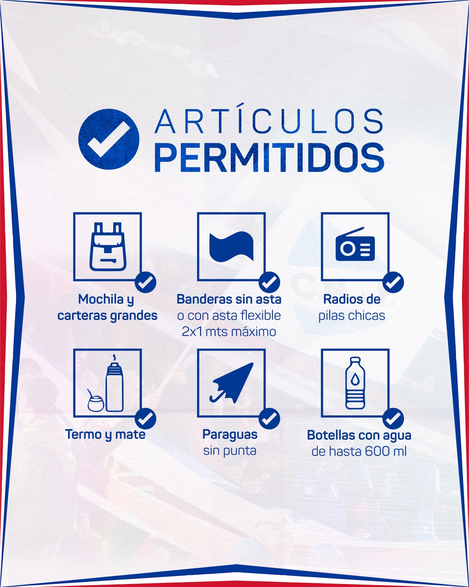 ¿Qué está permitido llevar? Termo y mate, mochilas y carteras grandes, banderas de hasta 2x1, radio de pilas chicas, botellas plásticas de hasta 600 ml, paraguas sin punta.