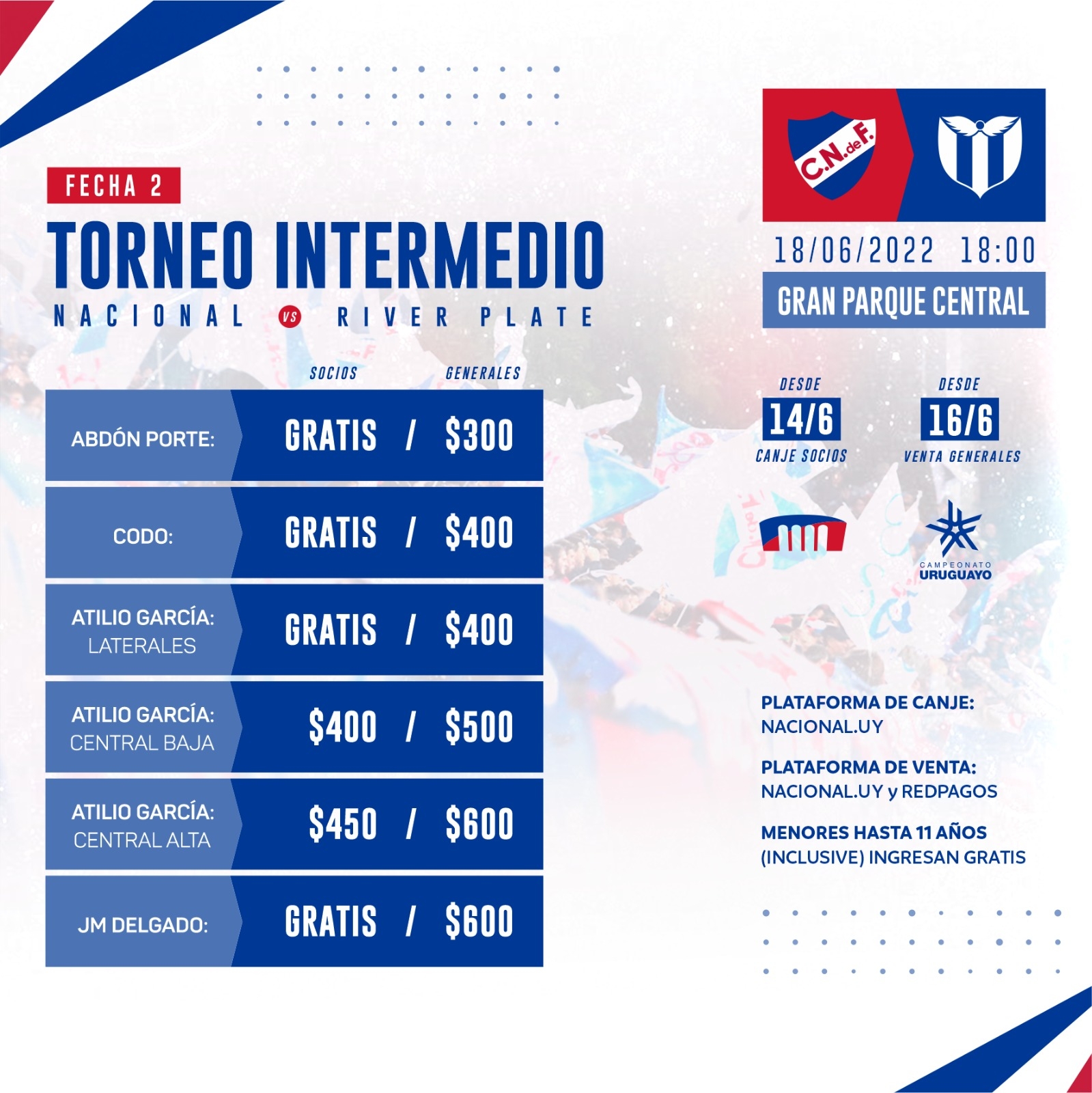 Tribuna Scarone puerta 8 visitantes, generales River Plate $ 300 a partir del 14/6, las mismas se pondran a la venta a través de Redpagos y Redtickets.