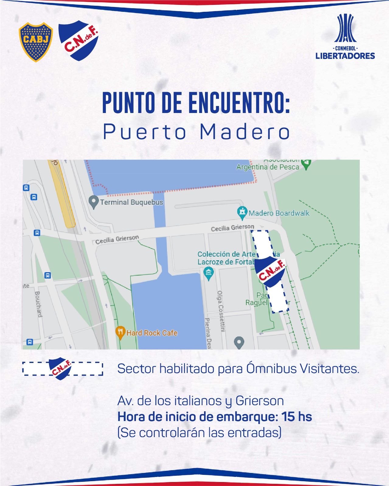 El punto de encuentro para la hinchada de Nacional será en Puerto Madero (Avenida de los Italianos y Grierson), donde a partir de las 15:00 horas los hinchas comenzarán a embarcar en los ómnibus para que luego inicie un dispositivo de acompañamiento y direccionamiento a La Bombonera. Es importante aclarar que en este operativo no se permitirá el traslado de automóviles particulares o combis.