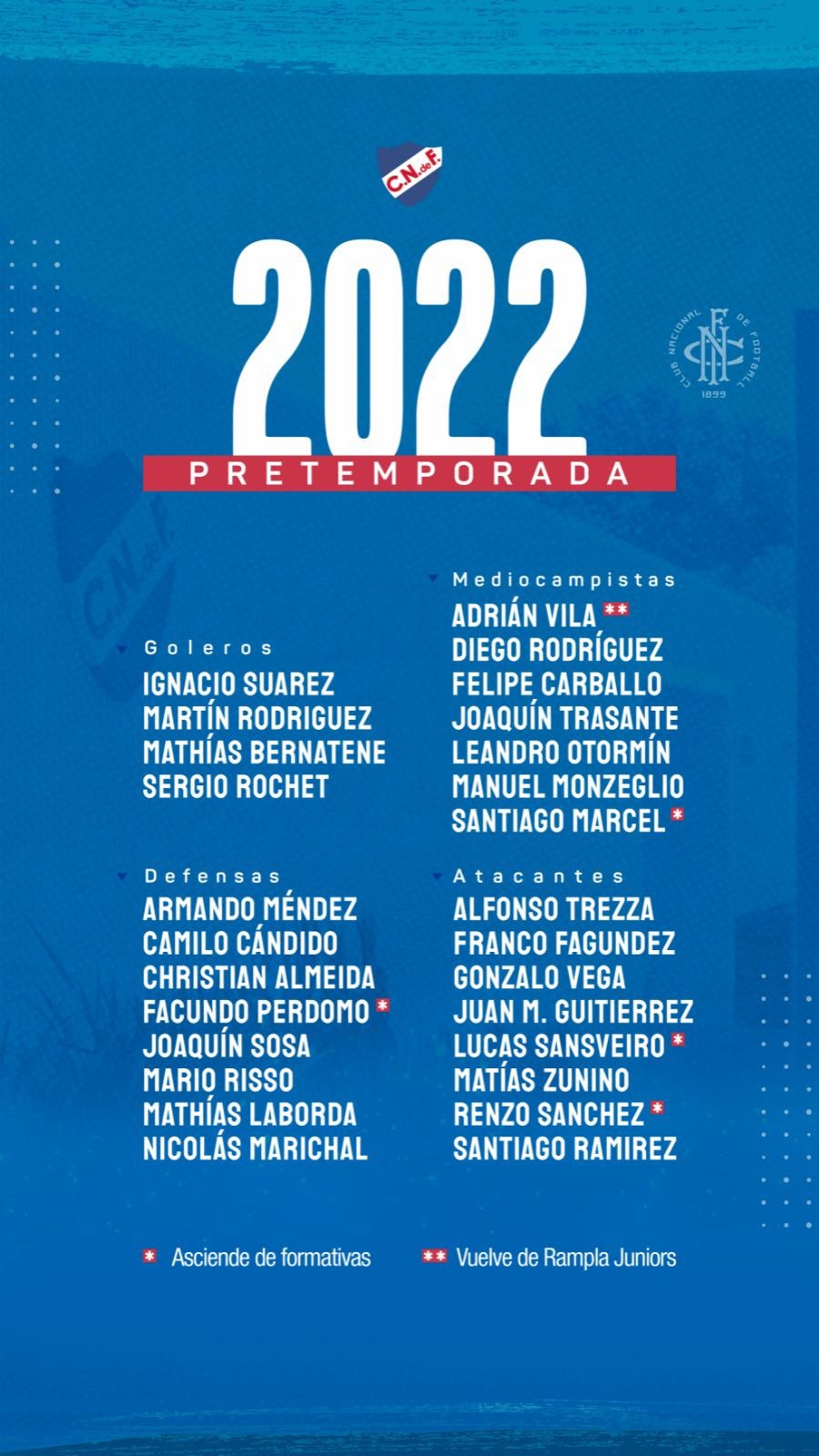 Este miércoles Nacional inició los entrenamientos de cara a la temporada 2022 con cuatro caras nuevas desde las formativas: Facundo Perdomo, Santiago Marcel, Lucas Sanseviero y Renzo Sánchez.